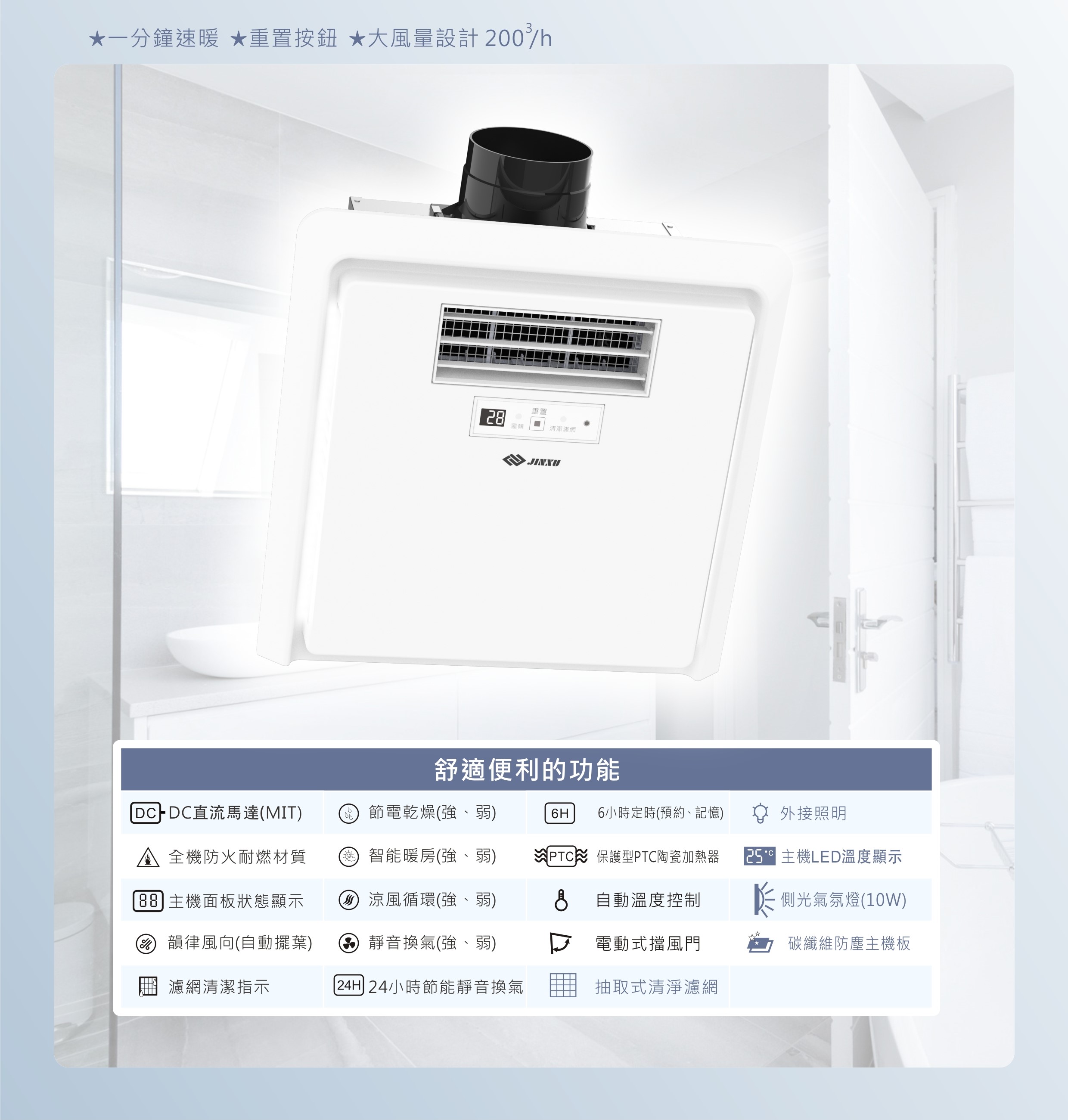 型號:DC302-RW (RF遙控器款-無線) 額定電壓:220V 額定頻率:60Hz 消耗功率:2400W 管道直徑:ψ100mm 主電源線:ψ5.5mm 安裝尺寸:305×280×180mm 主機重量:7kg 商品產地:台灣